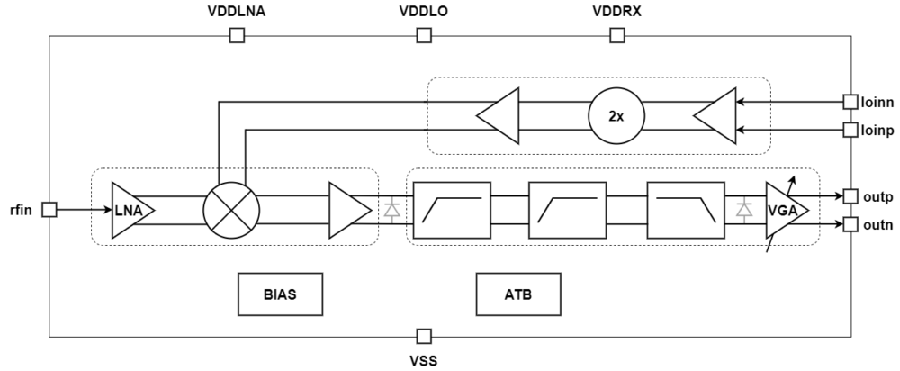 The WEA7681RX22G is a complete Zero-IF receiver for radar applications covering the 76 GHz to 81 GHz automotive band. The receiver integrates a Low Noise Amplifier, a down conversion mixer, a 1st order active highpass filter, a 1st order passive high pass filter and a 3rd order lowpass filter and a variable gain amplifier with digital gain control. The local oscillator chain is also integrated on the same IP. The LO accepts an input at 38GHz to 40.5GHz. The receiver has a dual saturation detector scheme for strong blocker detection at the mixer and the filter output. The receiver has a build-in Analog Test Bus (ATB) for complete monitoring of the bias conditions of all blocks, for FuSa. It is implemented in 22FDX FDSOI process. The WEA7681RX22G occupies a silicon area of 1450 um x 450 um.